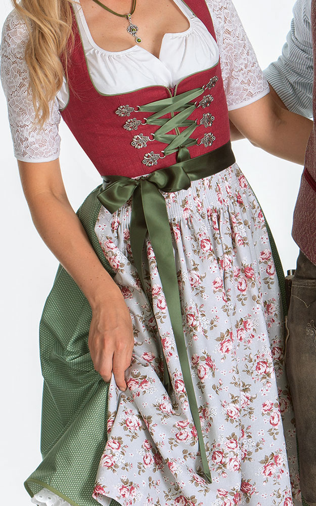 Bildschönes Midi-Dirndl mit Filigranhaken und Satinband-Schnürung am Oberteil aus Strukturleinen und faltengelegtem Rock (Länge 70 cm) mit zarten Tupfen. Die Schürze mit romantischem Blumenmuster ist mit Satin-Schürzenbändern ausstaffiert.Bitte beachten Sie, dass Dirndlkleider auf Figur gearbeitet sind und eng sitzen müssen. Gegenüber modischer Kleidung fallen sie daher eher klein aus. Meist benötigen Sie daher eine Kleidergröße größer. Bitte beachten Sie deshalb unsere Maßtabelle.Die Seitennähte unserer Modelle sind so versäubert, dass Sie mit wenigen Handgriffen um bis zu eine Konfektionsgröße enger oder weiter gemacht werden können.Bei Fragen beraten wir Sie gerne telefonisch.Im Preis enthalten sind Dirndl und Schürze.