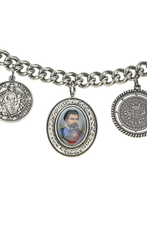 Charivari aus versilbertem Metall mit versilberten Anhängern und echter Trophäe.