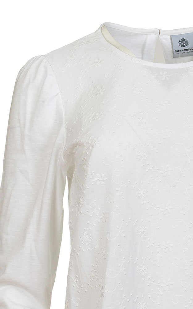 Duftige Trachtenbluse aus reiner Baumwolle mit Stickmuster und Shirt-Rücken.