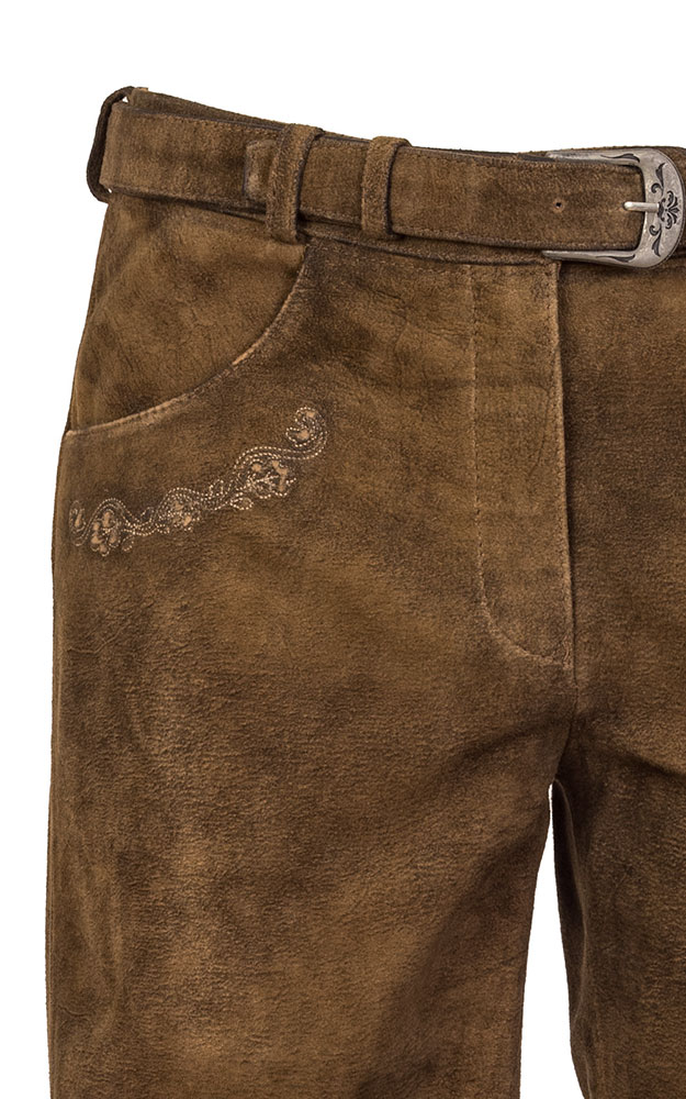 Weiche Damenlederhose aus Wildbock-Leder mit tonigen Stickereien.