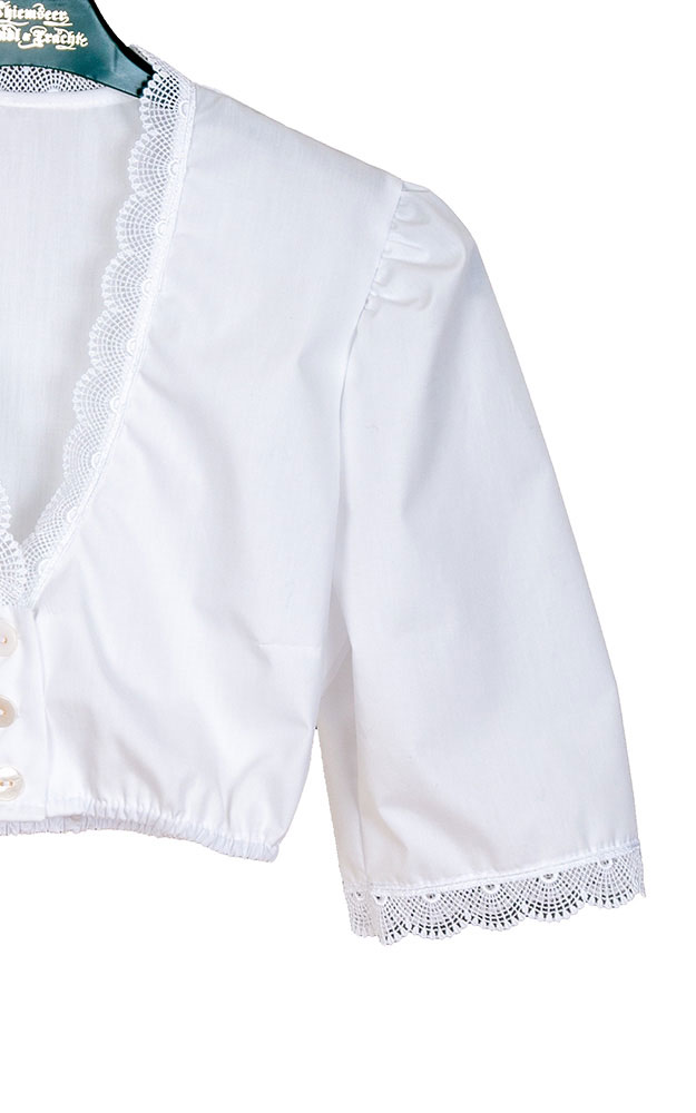 Bluse mit bildschönen Spitzen an Ärmeln und Ausschnitt. Modell Ella kommt mit einer ähnlichen Spitze wie der abgebildeten.