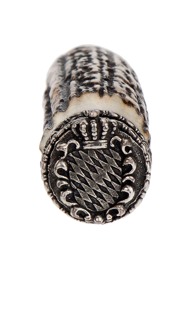 Rostfreie, handgeschmiedete Klinge aus Solingen inkl. Lederscheide mit Beschlägen aus Edelstahl. Klingenrücken und Meißel sind hochglanzpoliert.Der Übergang zwischen Klinge und Griff wird von einer versilberten Zwinge verziert. Am Ende des Griffs aus echtem Hirschhorn befindet sich eine kunstvoll versilberte Kappe mit Bayernwappen.Gesamtlänge inkl. Kappe: ca. 26cmKlingenlänge: ca. 10cm