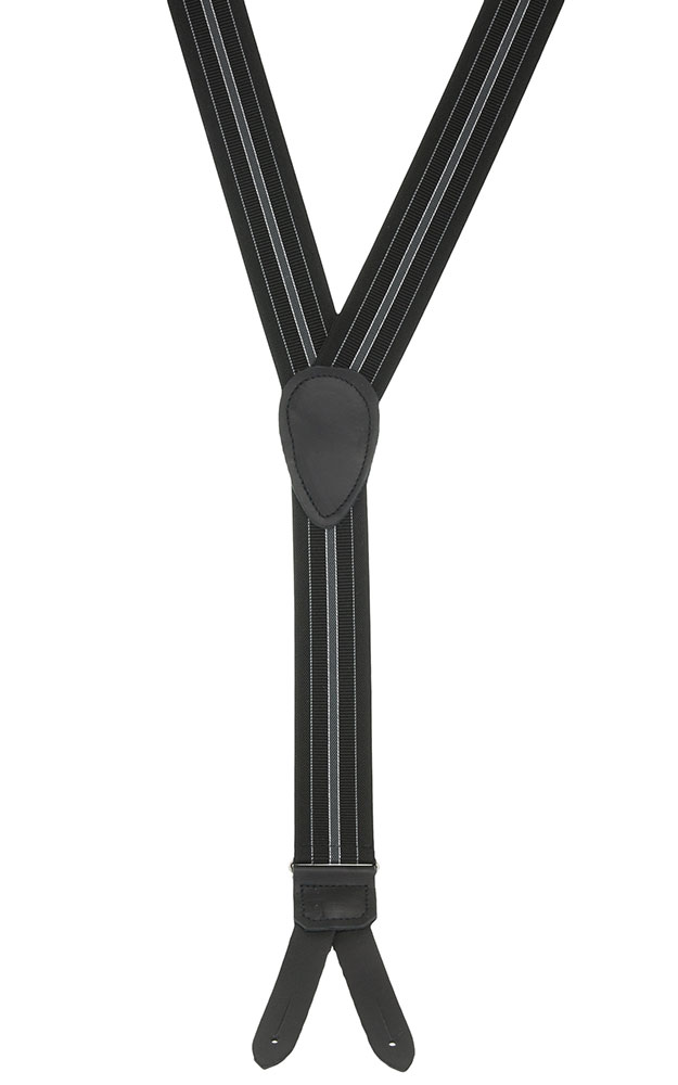Der traditionelle, elastische Hosenträger zu Ihrer Stresemann-Hose in grau/weiß/schwarz zum Knöpfen mit Lederrückenteil und Lederbiese.
