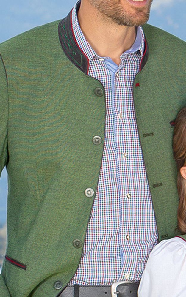 Sportlich-eleganter Janker aus knitterarmem Struktur-Material (4 Innentaschen) mit Rückenfalte und -spange, schwarzem Ausputz und besticktem Stehkragen.Weitere abgebildete Artikel sind nicht im Preis enthalten.