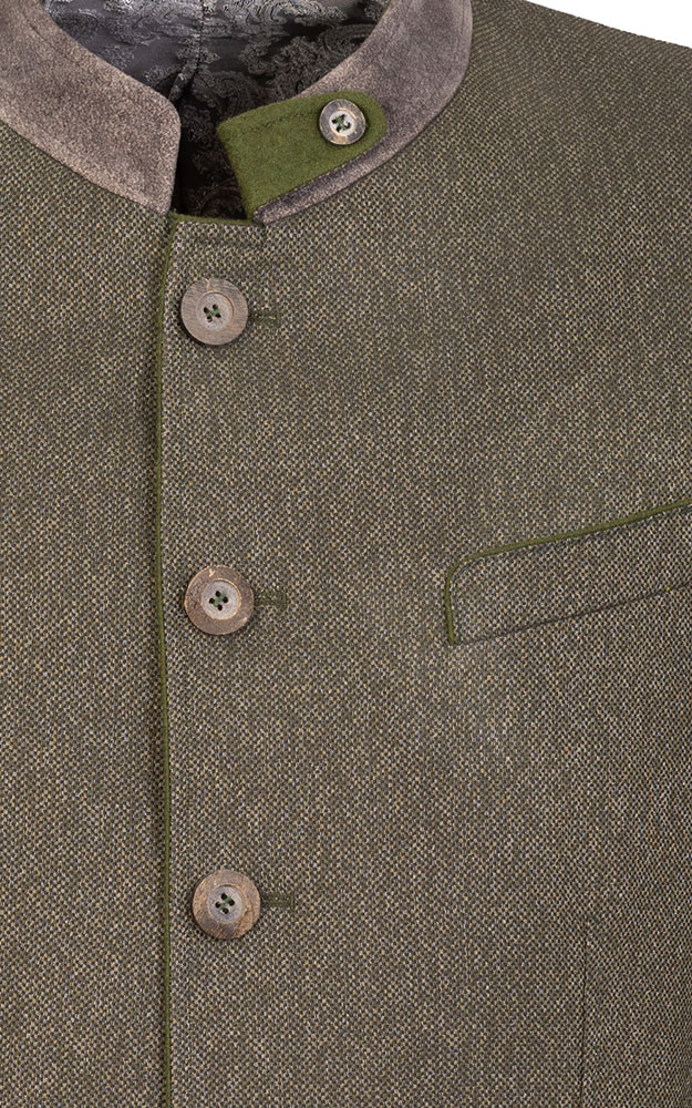 Leicht tailliert geschnittener Trachtenjanker, gefüttert, mit drei Innentaschen und Lederausputz am Kragen.