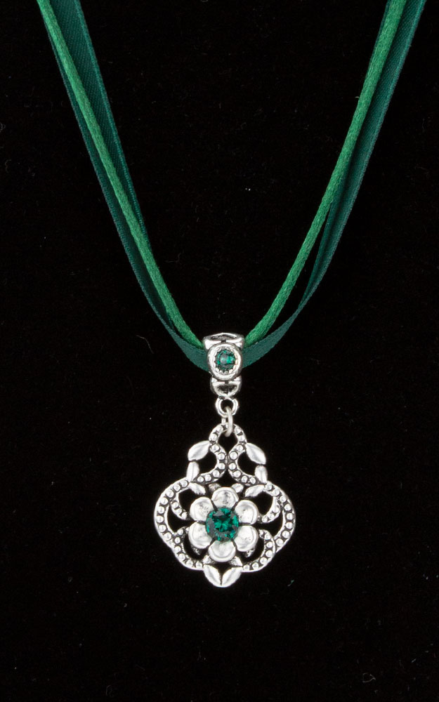 Trachten-Collier aus zwei glänzenden Satin-Schnüren mit einem antik-versilbertem Metall-Anhänger. Der Anhänger ist mit funkelnden Glas-Kristallen besetzt.