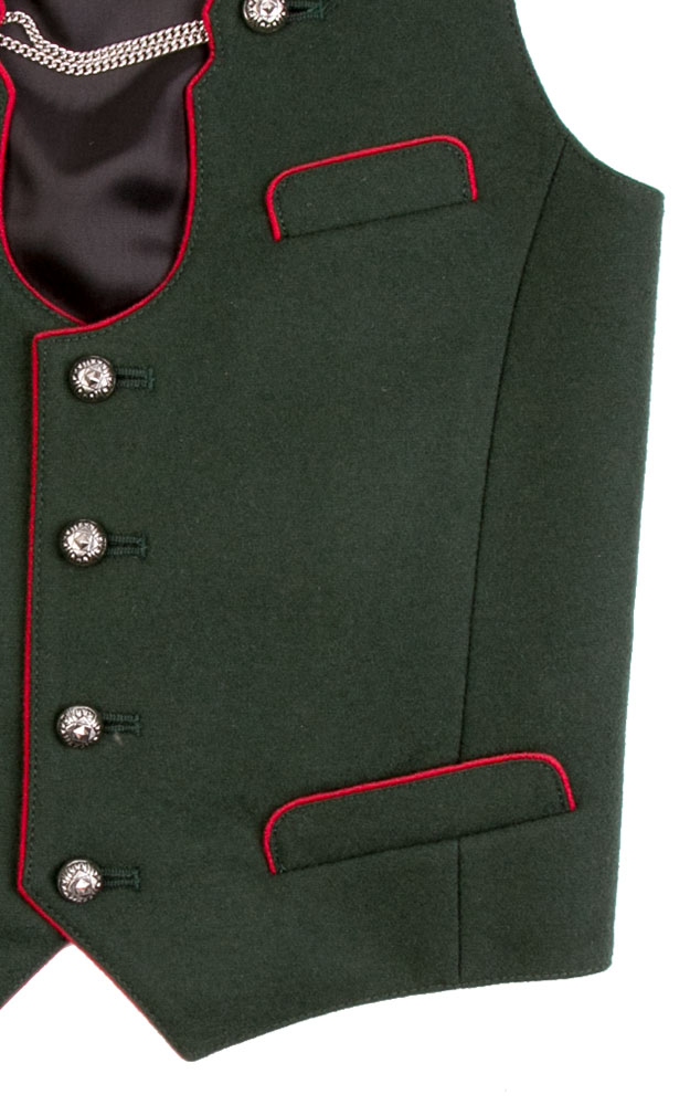 Traditionelle "Bayern-Weste" mit roter Kontrast-Einfassung, schwarzem Stoffrücken und typischem Ketterl-Verschluss.