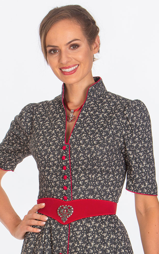 Feminines, durchgeknöpftes Trachtenkleid aus besonders weichfallendem Material mit hüftflach geschnittenem, faltengelegtem Rock, dekorativen roten Knöpfen und Kontrasteinfassung - auch am aktuellen Stehkragen. Bitte beachten Sie, dass Dirndlkleider auf Figur gearbeitet sind und eng sitzen müssen. Gegenüber modischer Kleidung fallen sie daher eher klein aus. Bitte beachten Sie deshalb unsere Maßtabelle.Die Seitennähte unserer Modelle sind so versäubert, dass Sie leicht um bis zu eine Konfektionsgröße enger oder weiter gemacht werden können.Bei Fragen beraten wir Sie gerne telefonisch.Im Preis enthalten ist das Dirndl ohne Schürze, ohne Bluse oder weitere abgebildete Artikel.