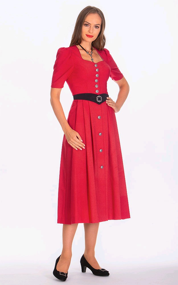Feminines, durchgeknöpftes Trachtenkleid aus knitterarmem Strukturmaterial mit dekorativen Metallknöpfen, schlanken Ärmeln und hüftflach geschnittenem, faltengelegtem Rock. Das i-Tüpferl dazu ist der separat erhältliche Antikleder-Ketten-Gürtel.Weitere abgebildete Artikel sind nicht im Preis enthalten.