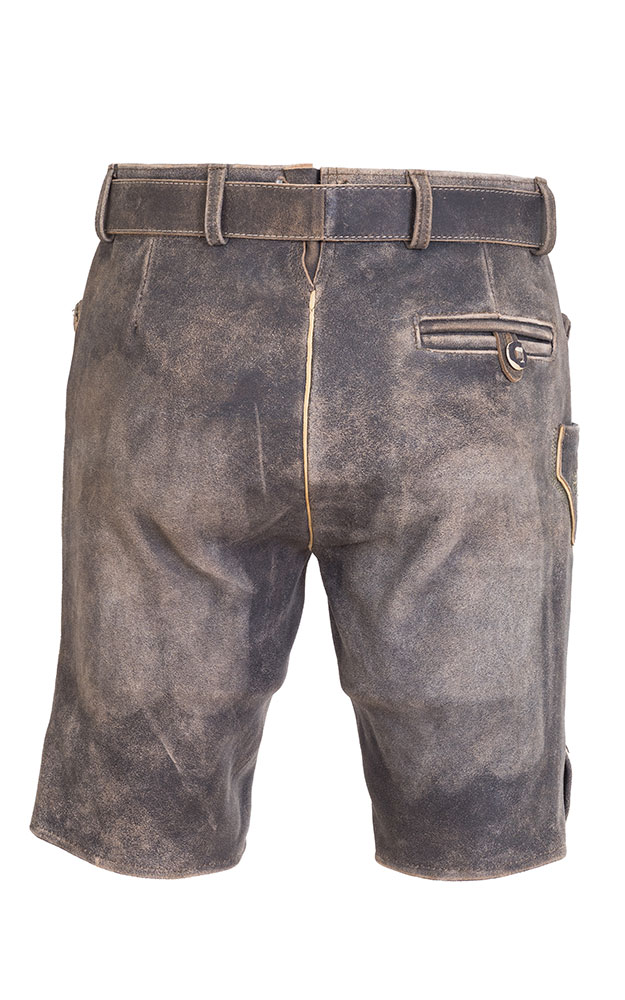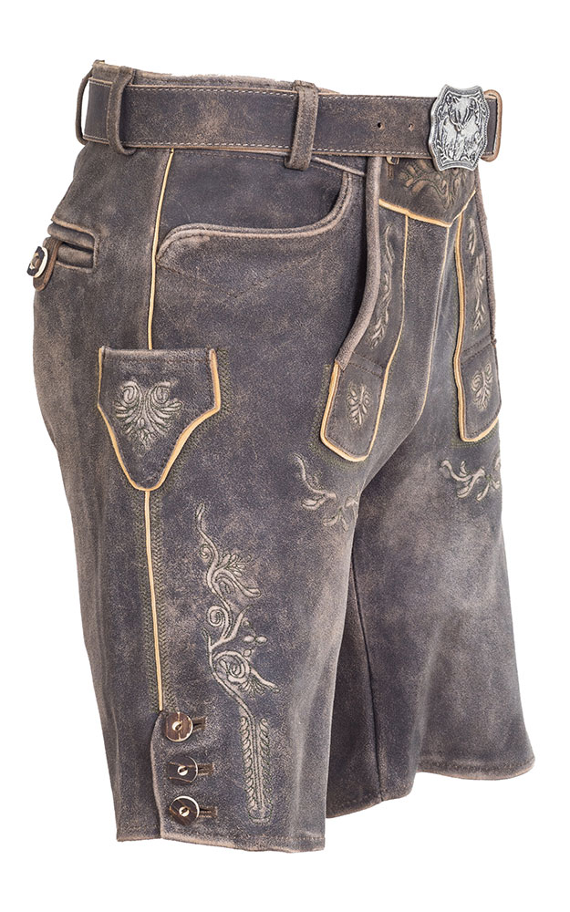 Urige Lederhose aus weichem Ziegen-Veloursleder in aktuellem Used-Look mit passendem Gürtel, Gesäßtasche Messertasche und plastischen Stickereien.