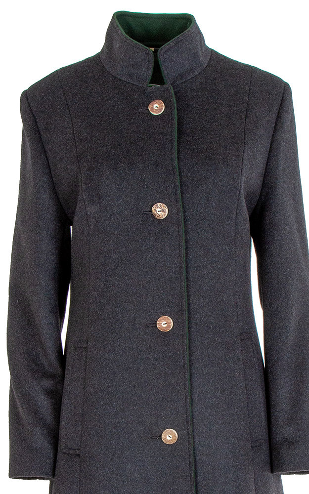 Eleganter Lodenmantel mit tannengrünem Ausputz an den Kanten, Stehkragen sowie Metallknöpfen.