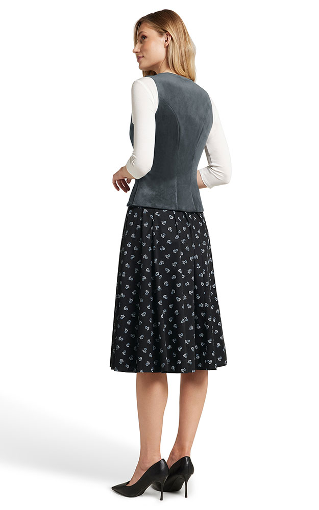 Klassisches, rund ausgeschnittenes Mieder aus super weichem Samt. Komplett gefüttert, Paspel im Ausschnitt, hochwertige Knöpfe.