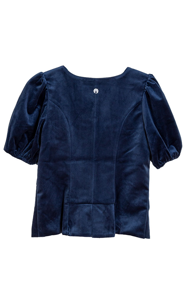 Klassisches, rund ausgeschnittenes Mieder aus super weichem Samt. Komplett gefüttert, Paspel im Ausschnitt, hochwertige Knöpfe.