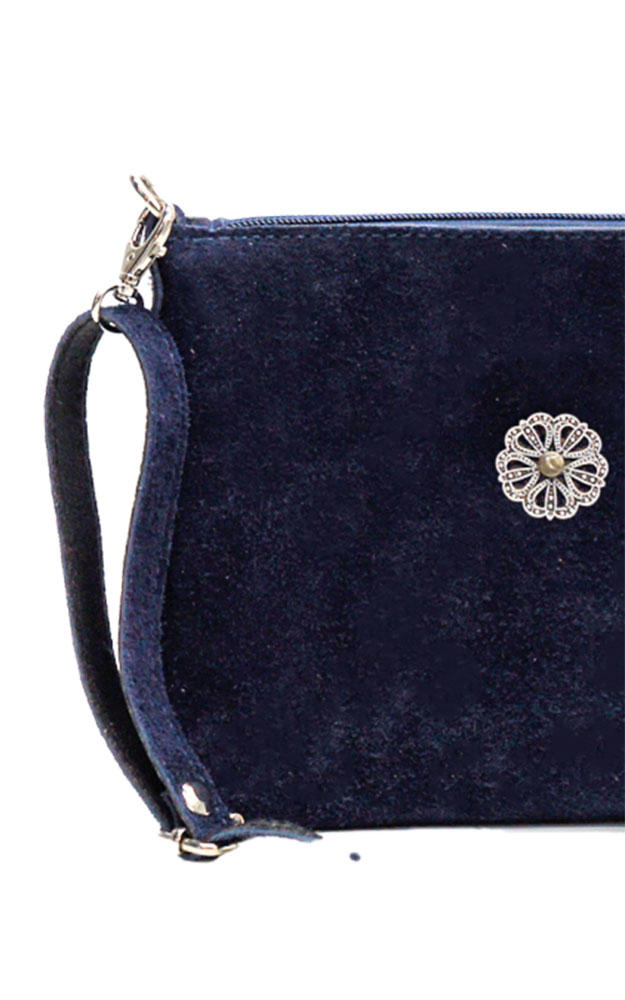 Schlichte Tasche aus Rinderveloursleder, zum Umhängen mit abnehmbaren Riemen und trachtiger Metall-Applikation verziert.