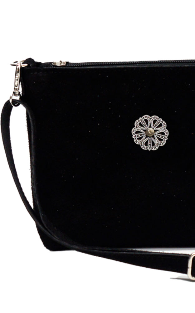 Schlichte Tasche aus Rinderveloursleder, zum Umhängen mit abnehmbaren Riemen und trachtiger Metall-Applikation verziert.