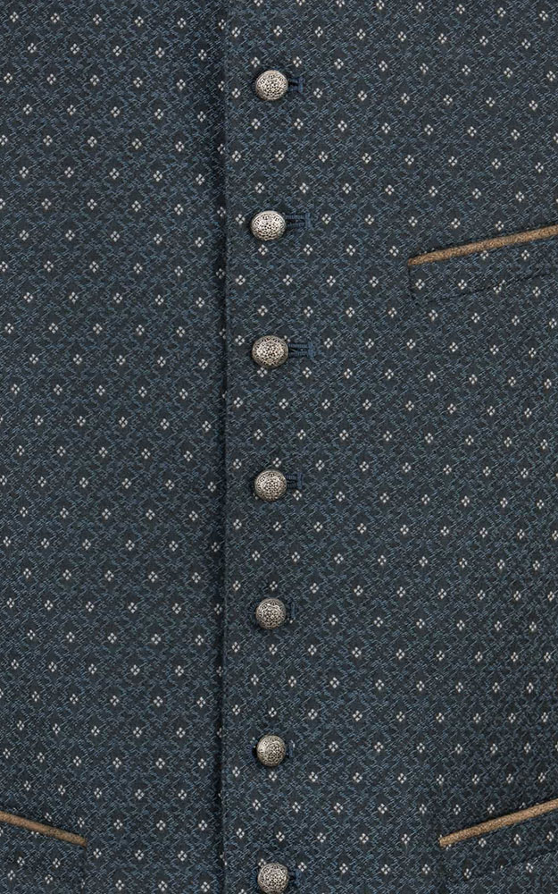 Das hochwertige, fein gewebte Strukturgewebe definiert diesen Klassiker unter den Trachtenwesten. Der edle Stehkragen und die farblich abgestimmten Paspeln, gefertigt aus hochwertigem Leder, verleihen dieser Weste ihren unverwechselbaren Charme. Die klassische, gerade Schnittführung gewährleistet eine exzellente Passform und ein angenehmes Tragegefühl. Die Rückseite besteht aus exklusivem Taftstoff und lässt sich mittels eines Riegels anpassen. Die Knöpfe runden das edle Erscheinungsbild gekonnt ab. Diese Trachtenweste harmoniert perfekt mit unseren traditionellen Trachtenhemden und ist ein unverzichtbares Element der klassischen Trachtenmode.